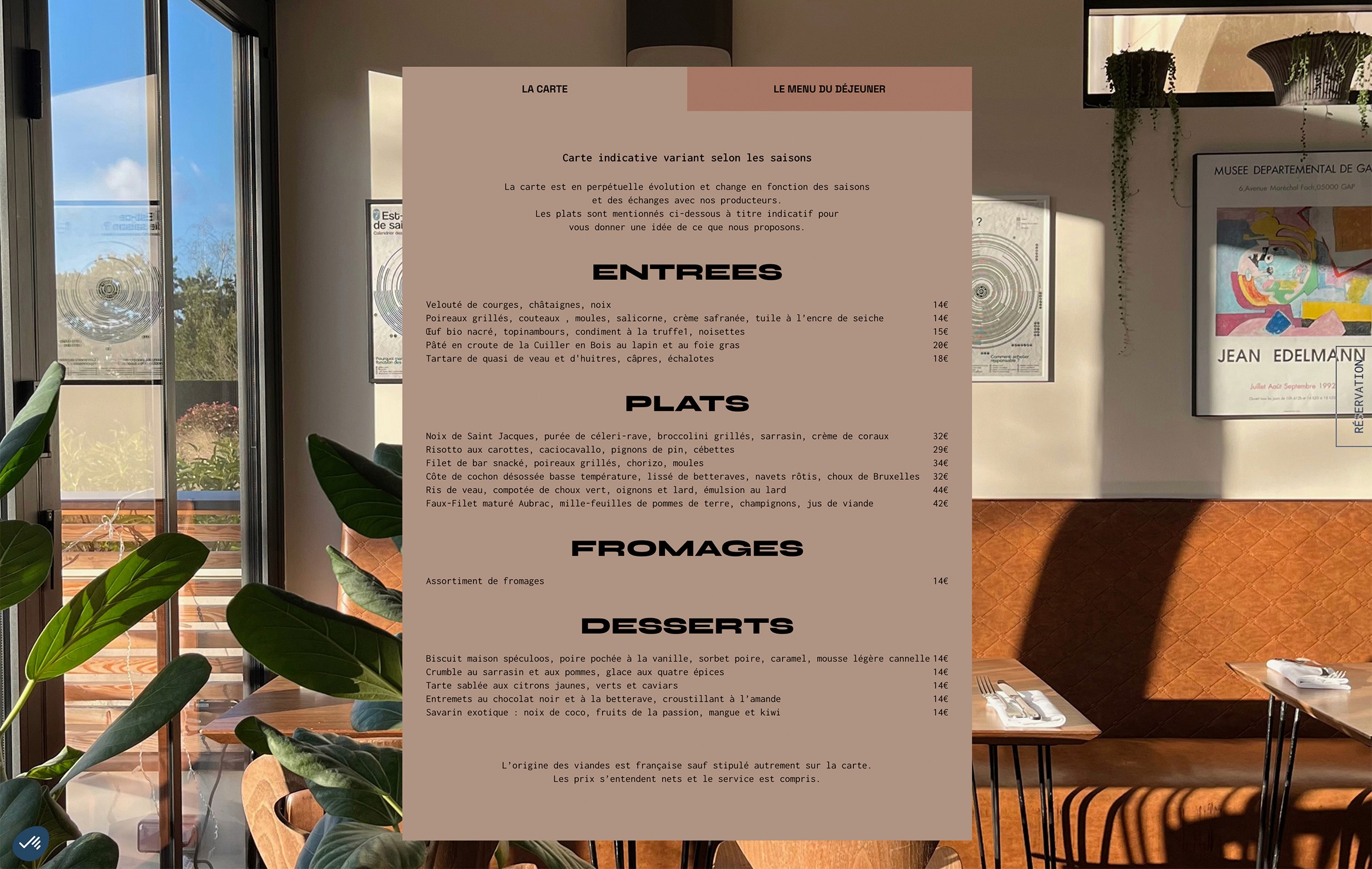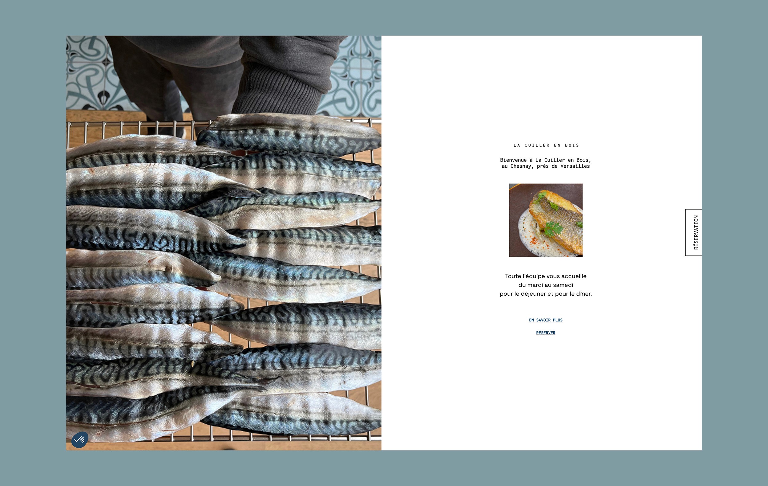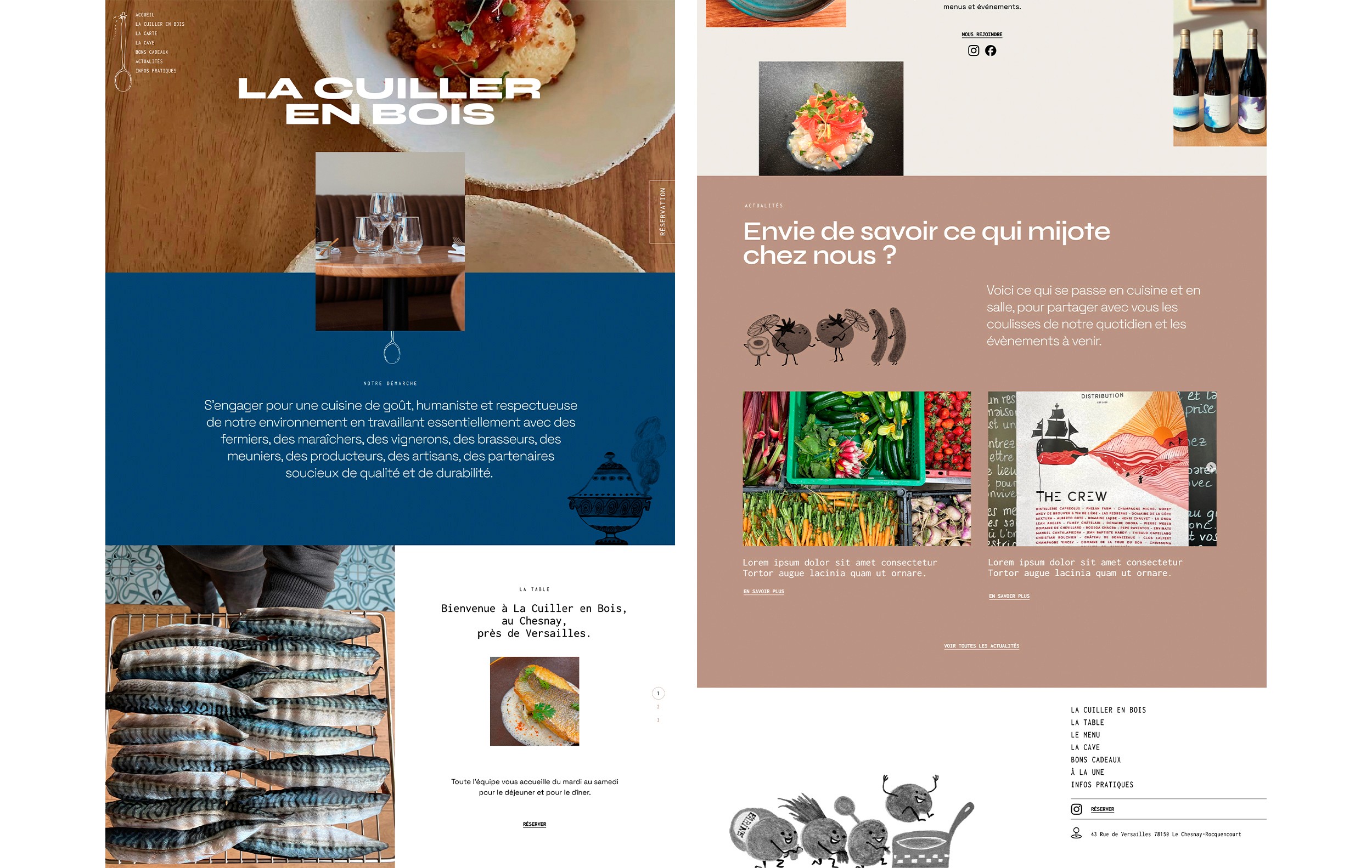 La Cuiller en bois, restaurant situé au Chesnay, près de Versailles, célèbre une cuisine de goût, sincère et respectueuse du vivant. Engagé aux côtés de producteurs attachés à la qualité et à la durabilité, le restaurant puise aussi son identité dans une histoire familiale : un livre de cuisine écrit et illustré dans les années soixante par la grand-mère du propriétaire. Inspirés par cet héritage, la décoration Mid-Century Modern et l’esprit chaleureux du lieu, nous avons imaginé un site au design épuré, à l’image de sa philosophie : simple, authentique et résolument humain.