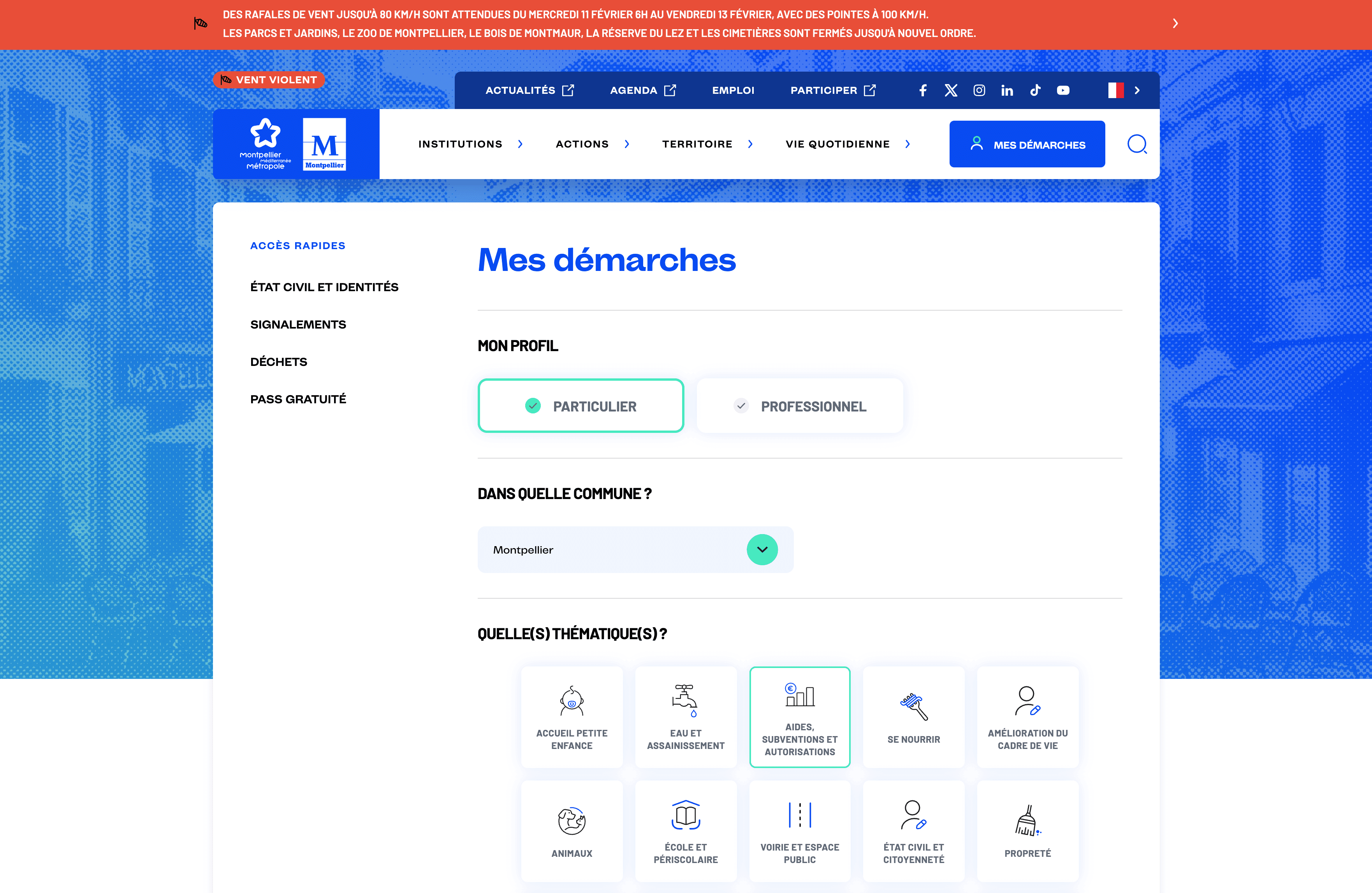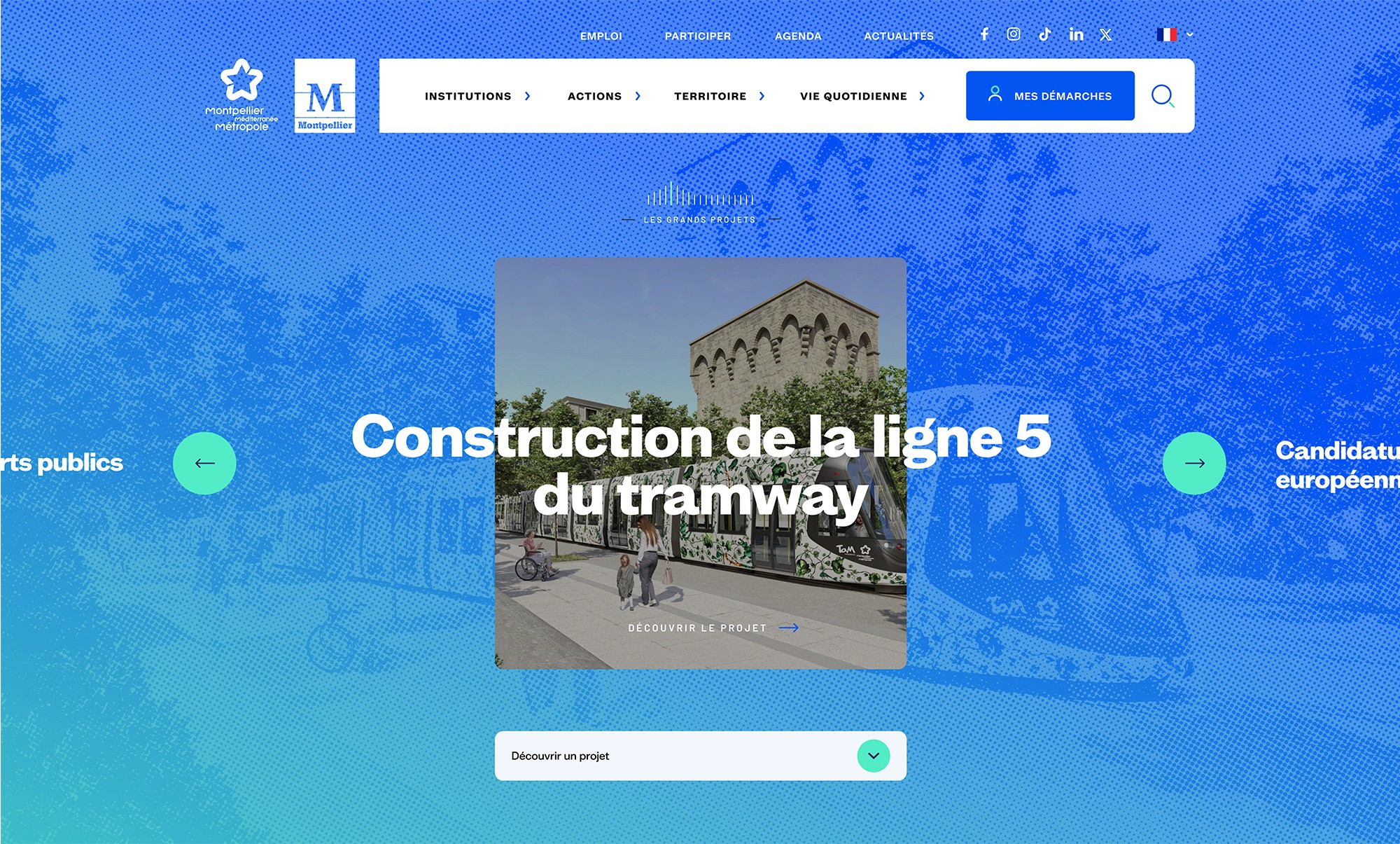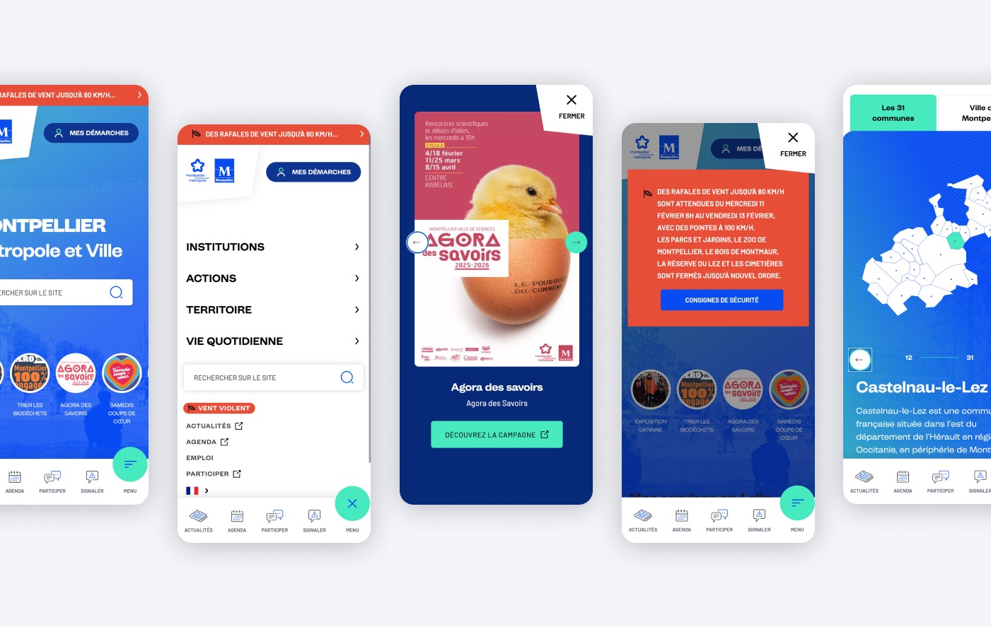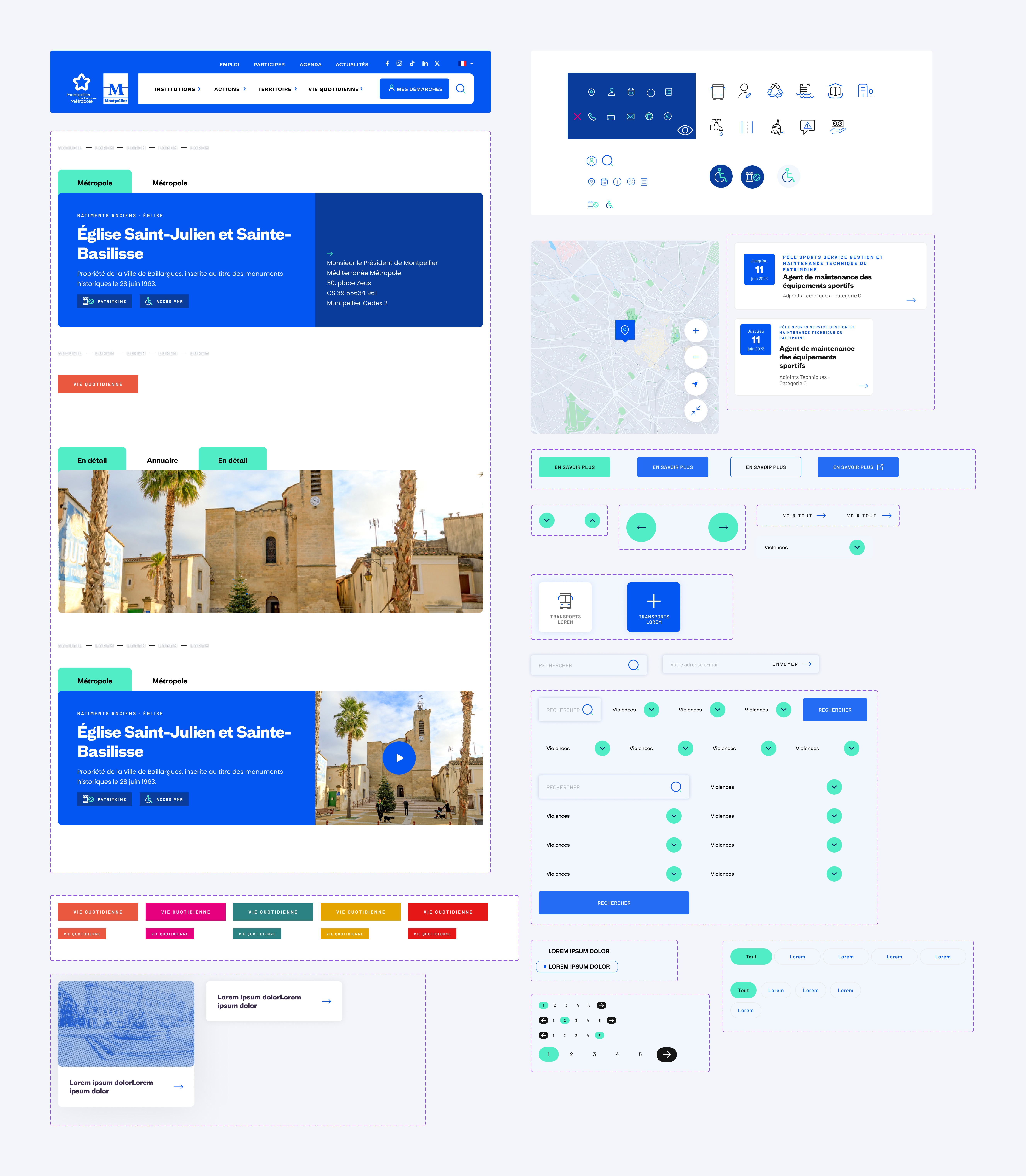 Pour Montpellier.fr, nous avons créé un site mutualisé pour la Ville et la Métropole, en adoptant un système de design basé sur l’Atomic Design, en étroite collaboration avec la Métropole, les développeurs et les UX/UI designers. Le défi consistait à unifier les contenus des deux entités tout en respectant les contraintes strictes des collectivités : accessibilité RGAA, développement technique, design responsable et inclusif. Il en résulte un univers graphique cohérent, pensé mobile-first, qui allie identité forte et flexibilité fonctionnelle.